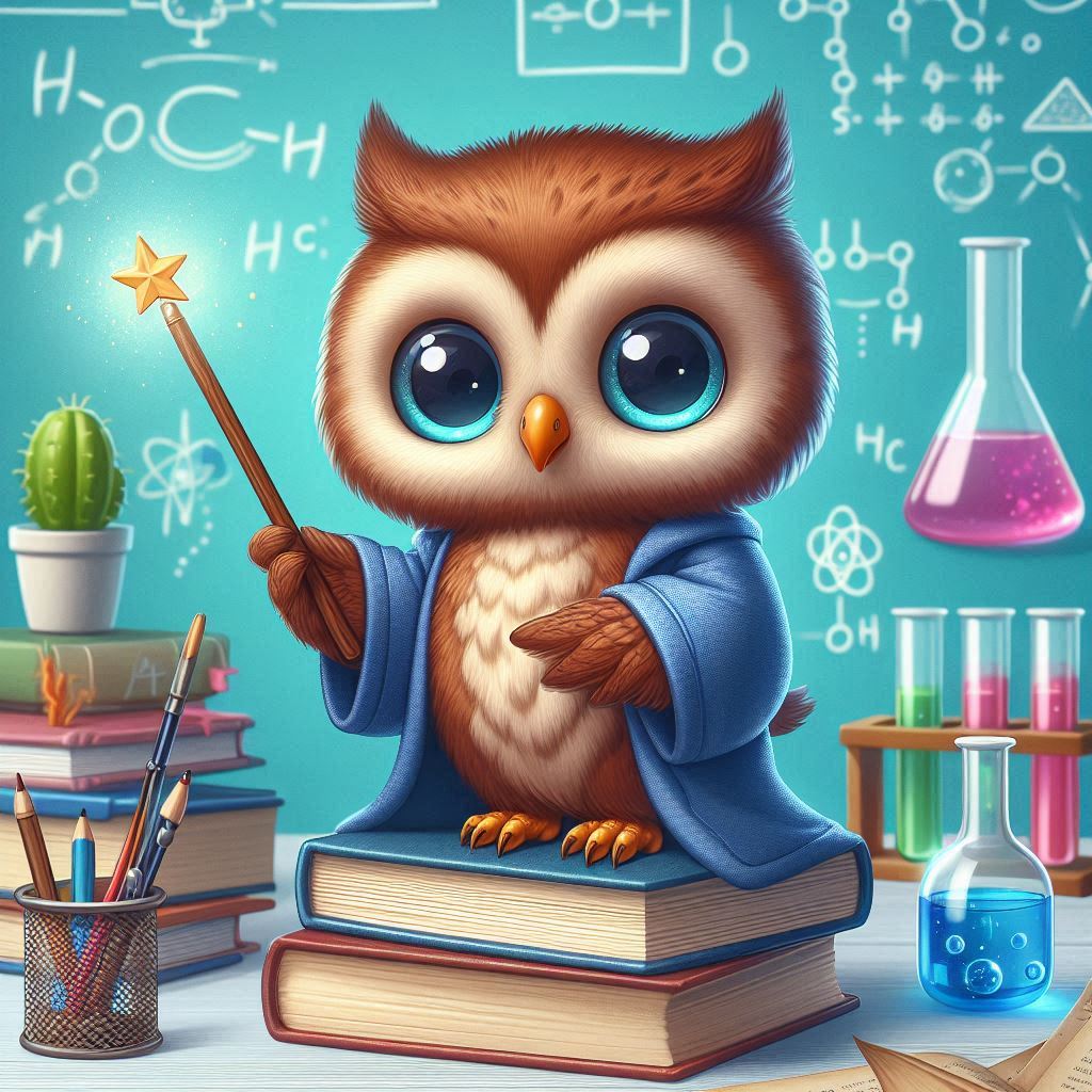 A charming owl wearing a wizard robe holds a wand atop books, surrounded by science tools and equations.