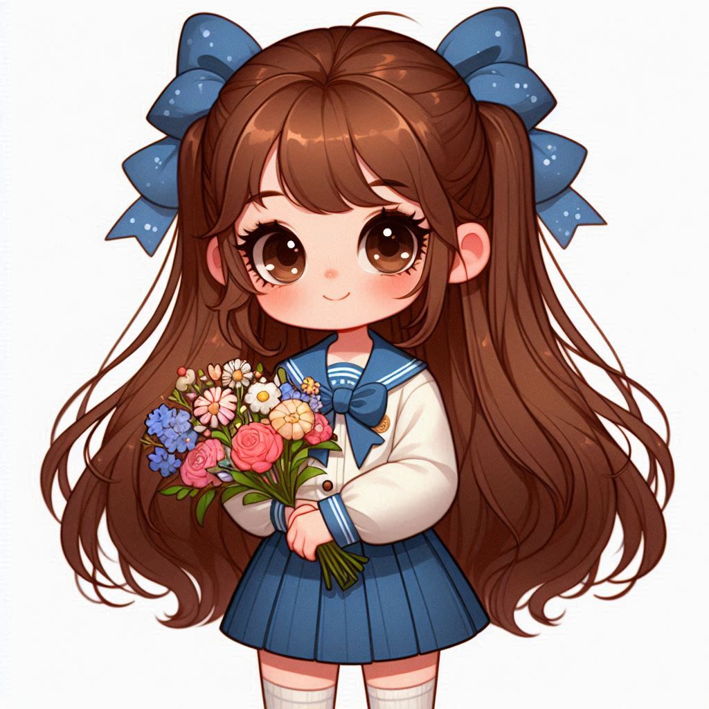 A young girl with long brown hair and blue bows holds a bouquet of colorful flowers, wearing a school uniform.