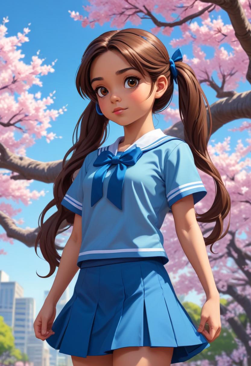 A schoolgirl stands confidently beneath blooming cherry blossoms in a vibrant outdoor setting.