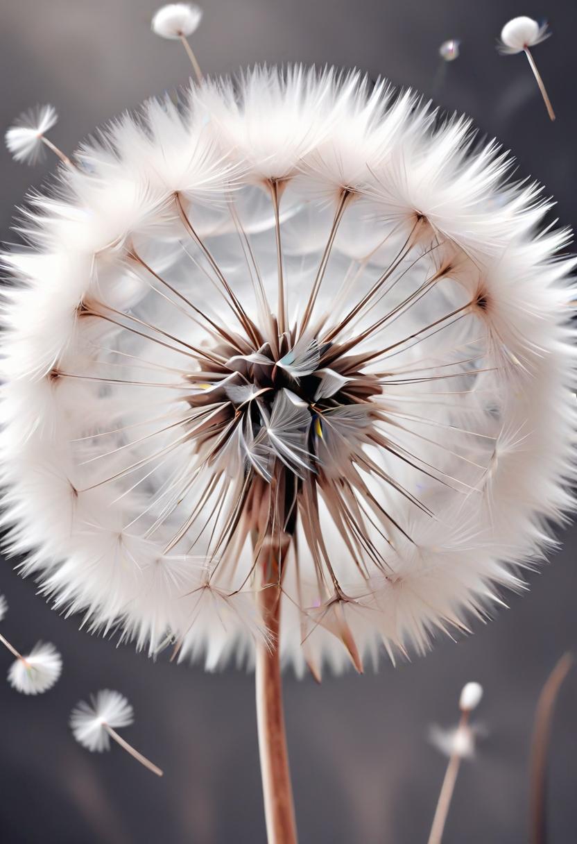A dandelion puff disperses its seeds into the air, creating a soft, whimsical atmosphere.