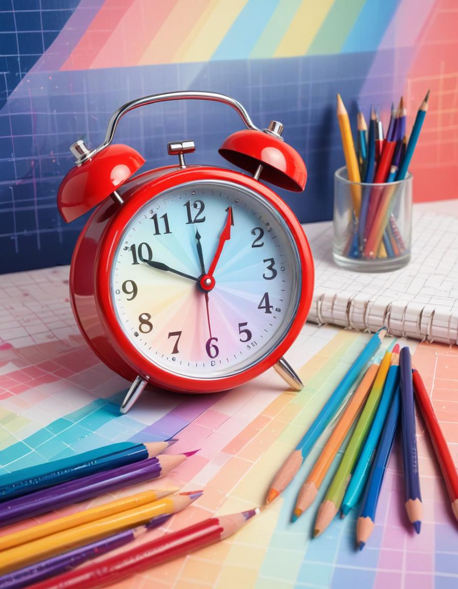 A red alarm clock displays the time amid colored pencils and a notepad, with a vibrant background.
