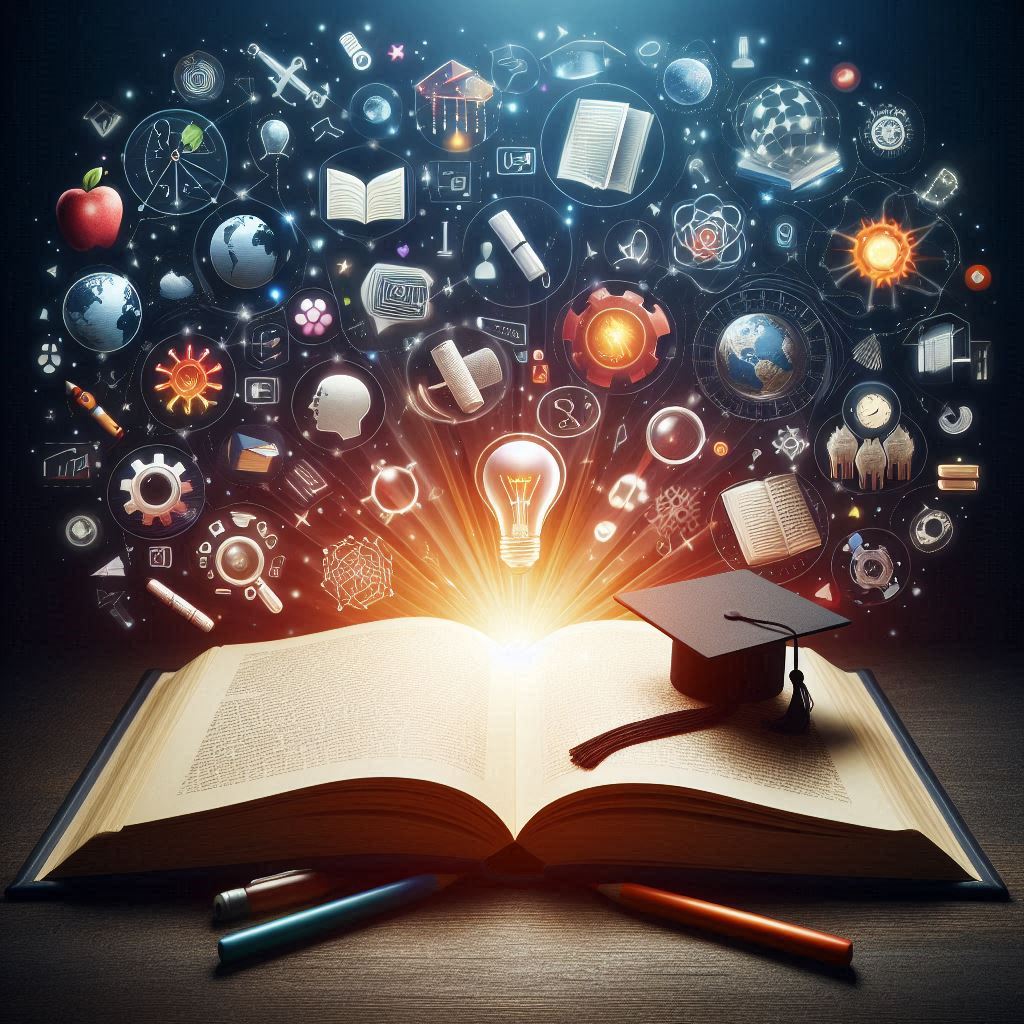 An open book displays a graduation cap with science and education icons emerging around it.