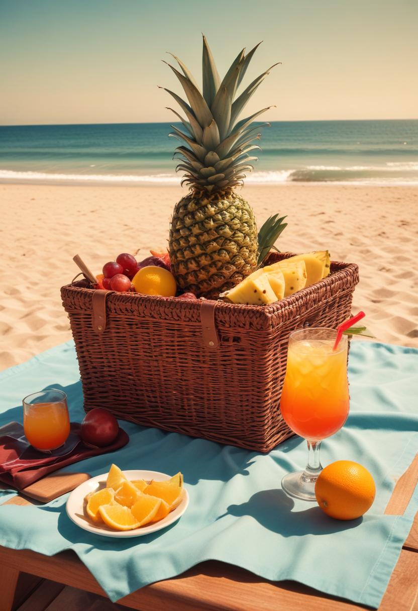 basket, beach, drinks, fruits, grapes, leisure, lemonade, ocean, oranges, outdoor, picnic, pineapple, refreshment, relaxing, sand, summer, sunlight, table, tropical, wicker