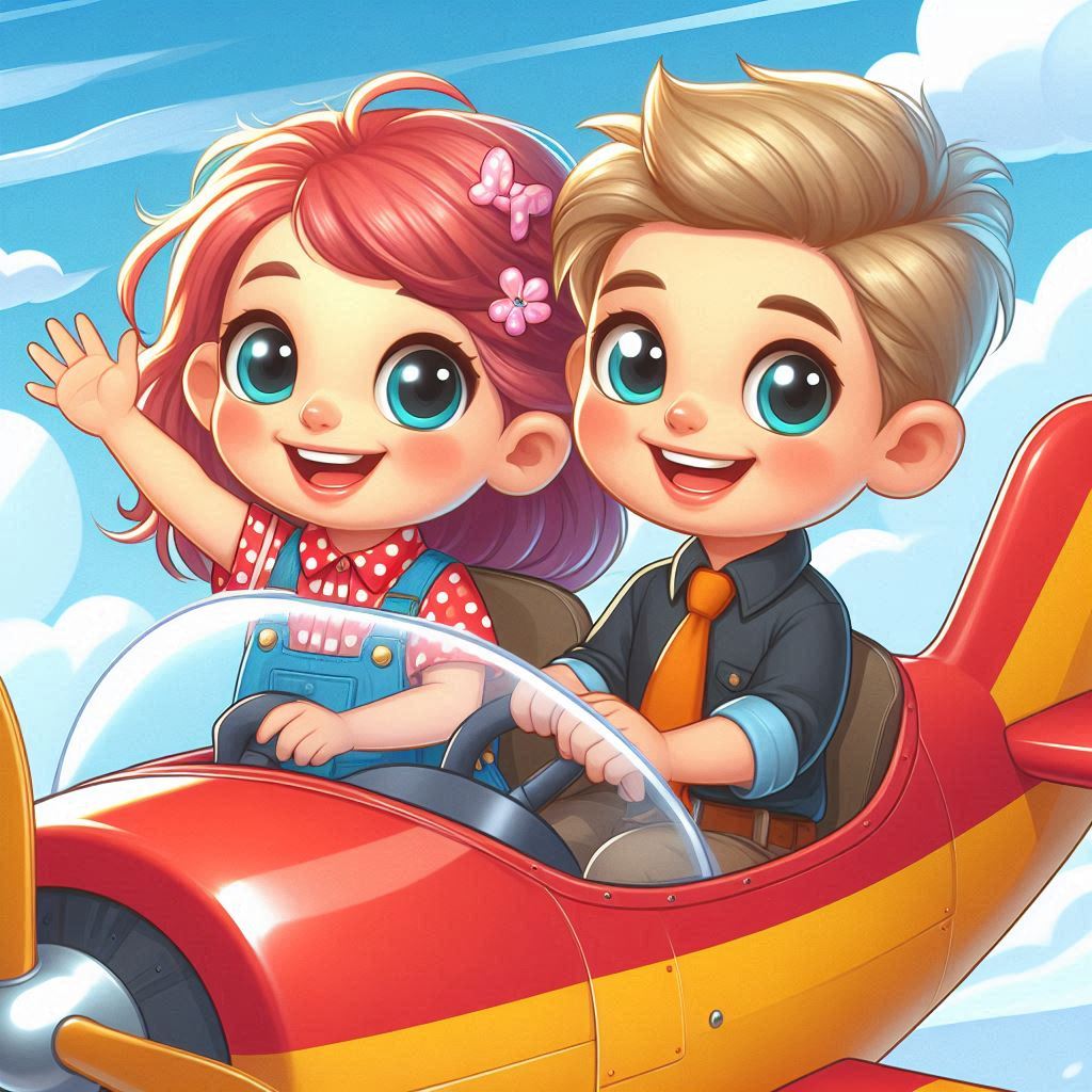 Two children joyfully pilot a colorful airplane against a bright blue sky.