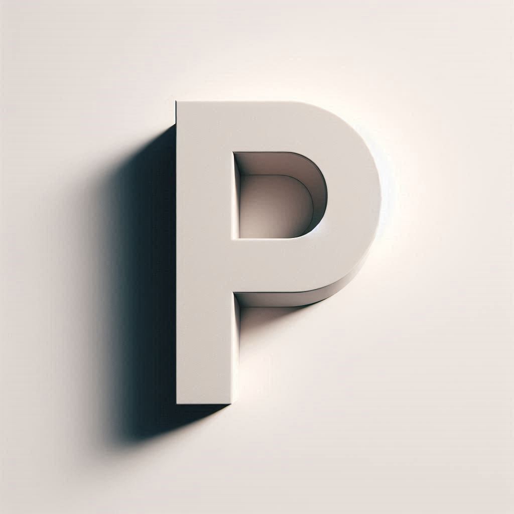 A three-dimensional letter P casts a soft shadow against the wall.