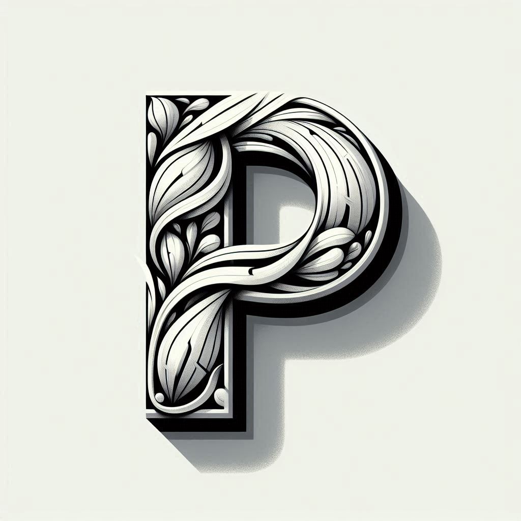 A creatively crafted letter P features an elaborate floral design with detailed line work and shadows.