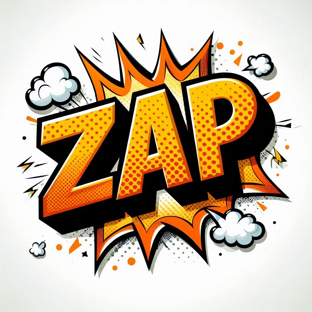 A dynamic zap bubble with bold lettering and explosive graphics conveys energy and excitement.