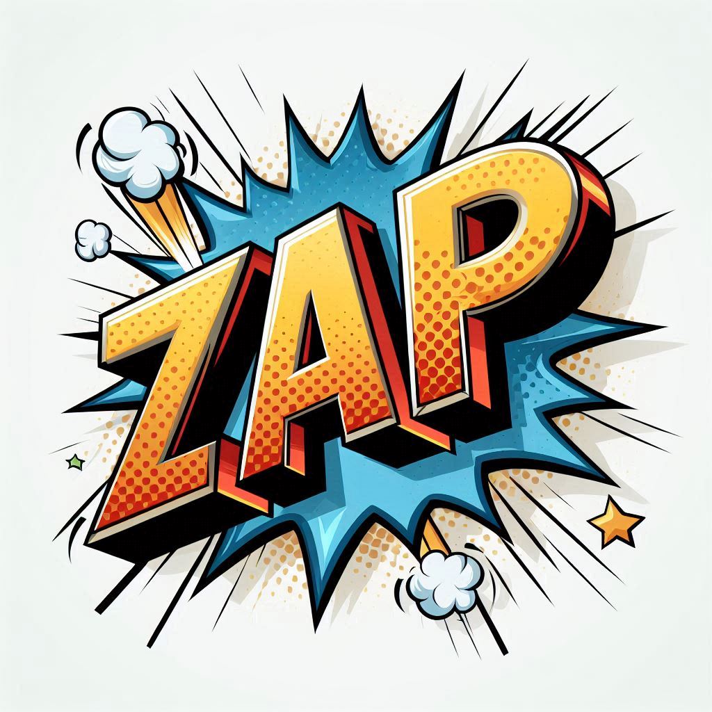 A bold and colorful zap graphic featuring dynamic effects and comic-style text.