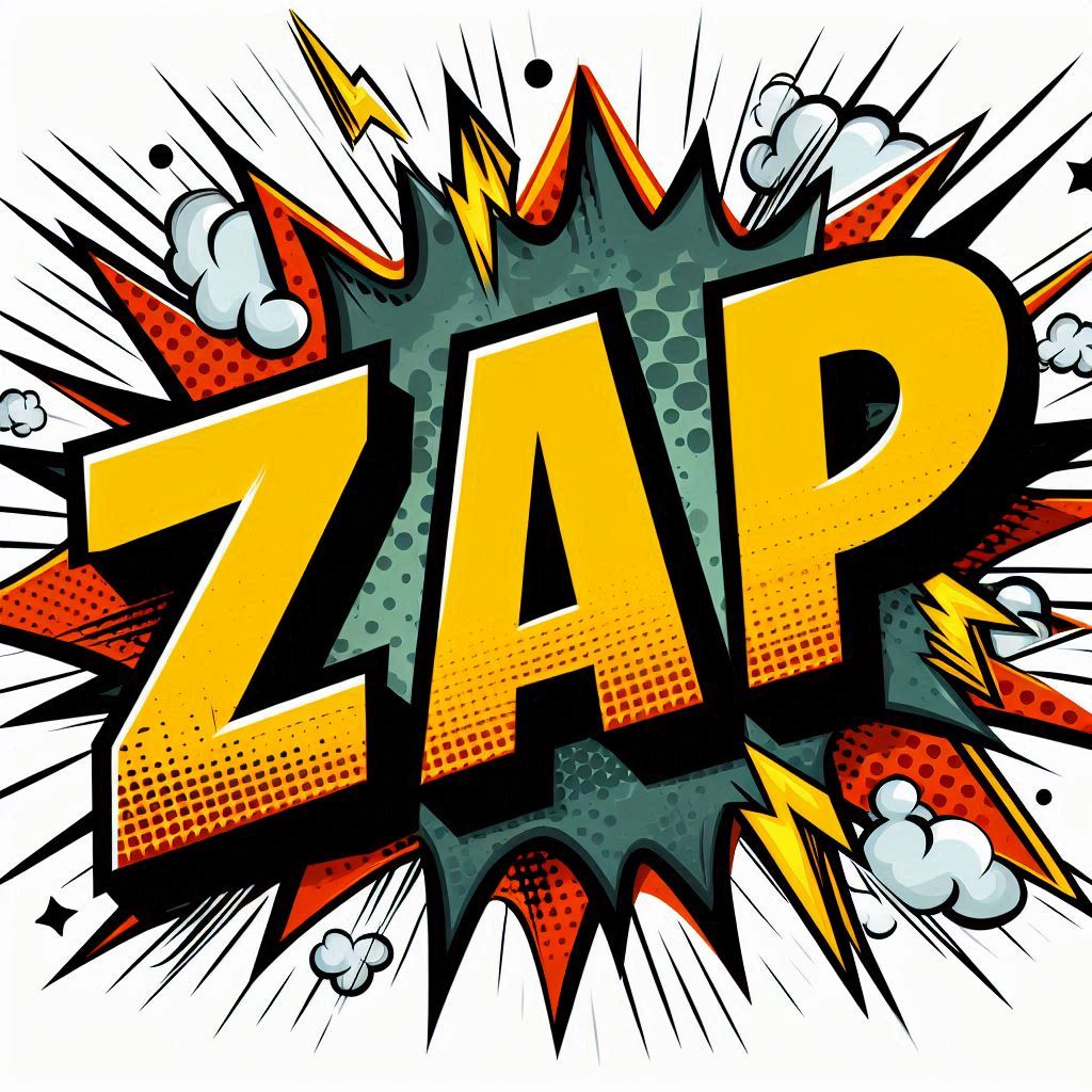 A dynamic design featuring the word Zap surrounded by bursts and lightning in vibrant colors.