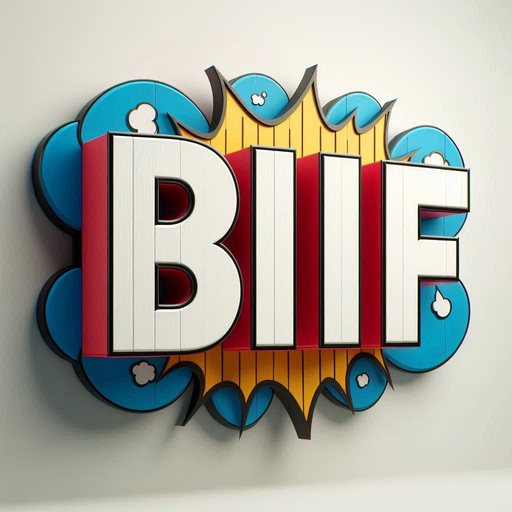 A vibrant sign featuring the word BIIF in bold letters against a playful background.