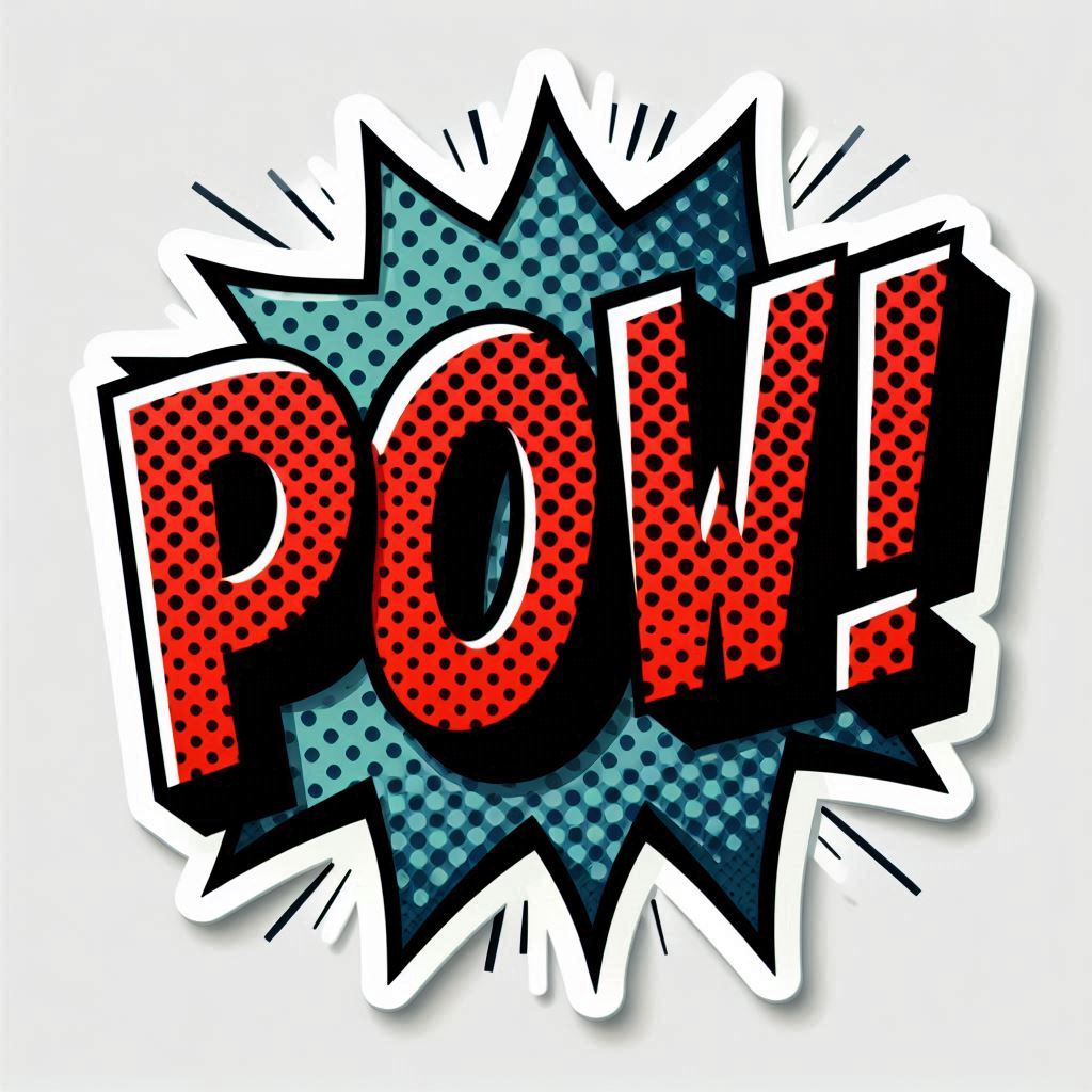 A vibrant pow graphic featuring bold red letters on a blue background, emanating a dynamic comic book style.
