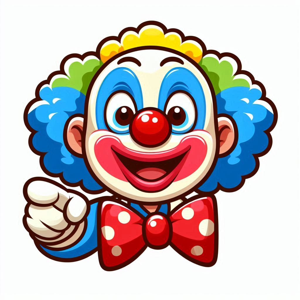 A colorful cartoon clown with a big smile and a polka-dotted bowtie points playfully.