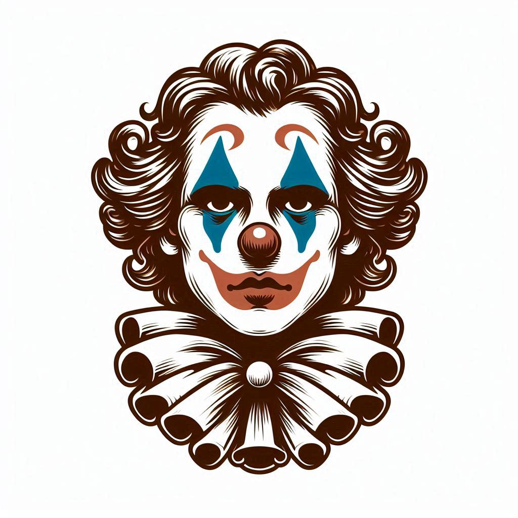 art, blue, character, circus, clown, collar, creepy, design, expression, face, horror, illustration, makeup, paint, portrait, ruffled, style, theatrical, vintage, whimsical