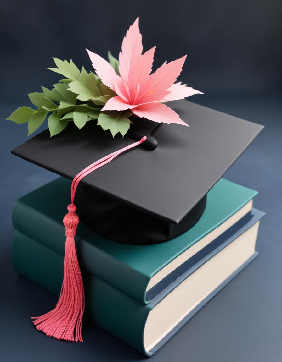 A black graduation cap adorned with a pink flower rests atop a stack of green and white books.
