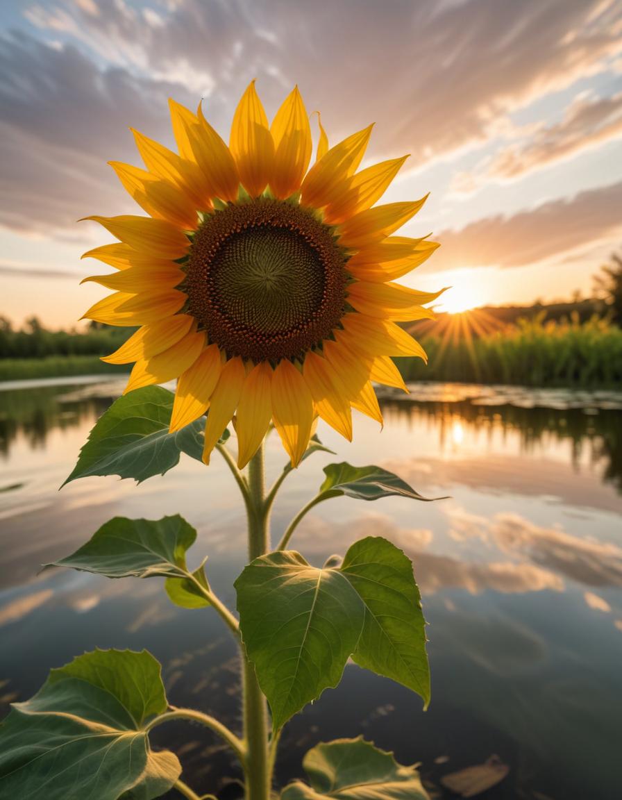 A vibrant sunflower stands tall by a tranquil body of water as the sun sets, casting a warm glow.