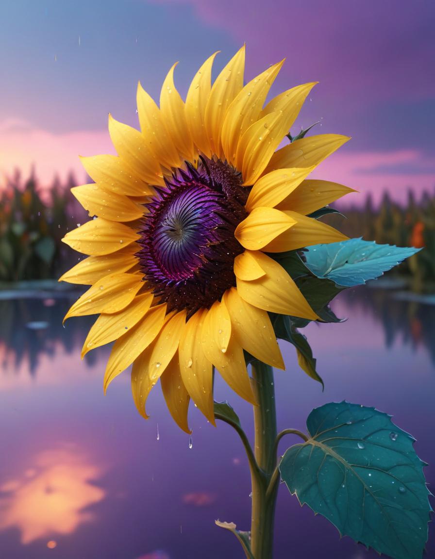 Vibrant sunflower reflecting at sunset by tranquil waters
