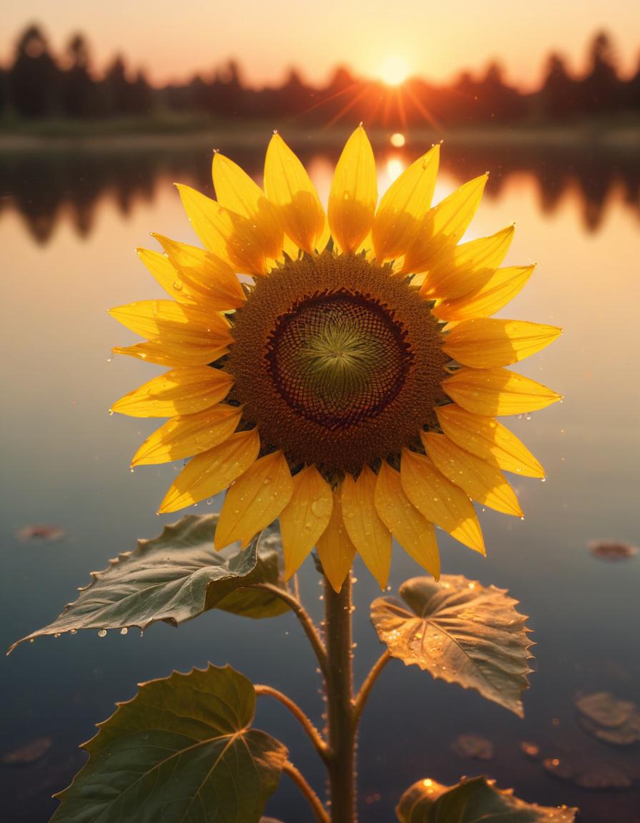 Sunflower at dawn by the tranquil lake