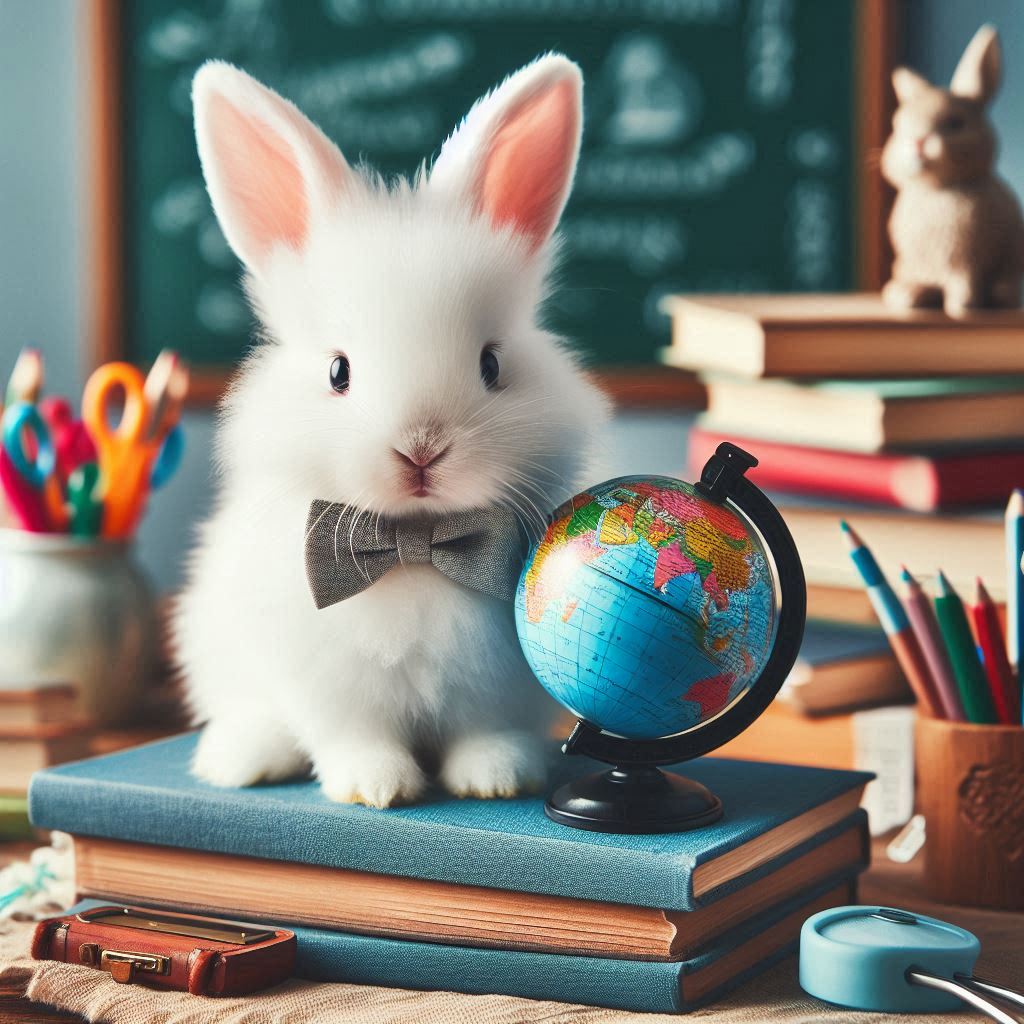 adorable, animal, books, bow, classroom, creative, cute, decoration, education, fluffy, globe, kid's, learning, rabbit, room, school, stationery, study, supplies, tie