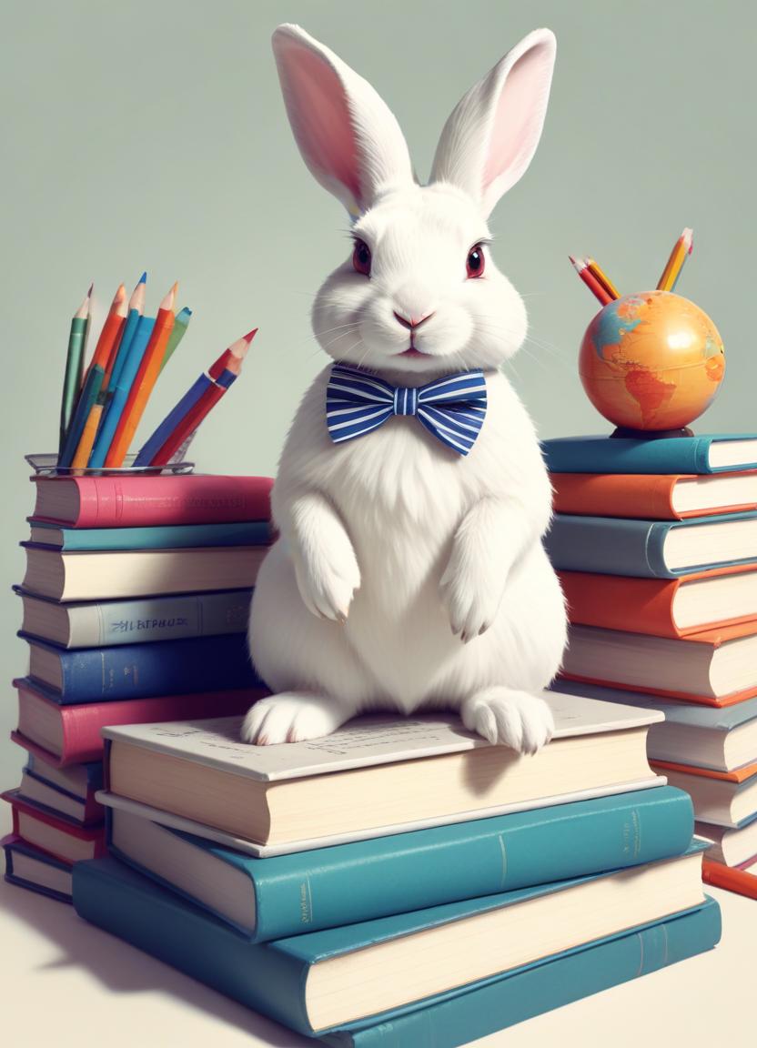 A white rabbit in a bowtie stands atop colorful books with stationery and a globe nearby.