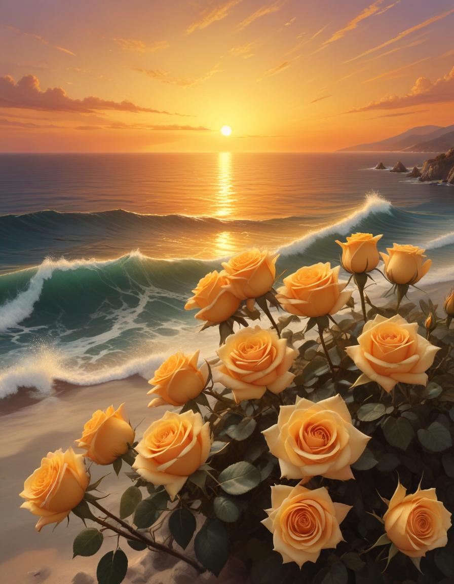 beach, beauty, coastline, evening, floral, flowers, gold, horizon, landscape, nature, ocean, petals, roses, seascape, serenity, sky, sunlight, sunset, tranquility, waves
