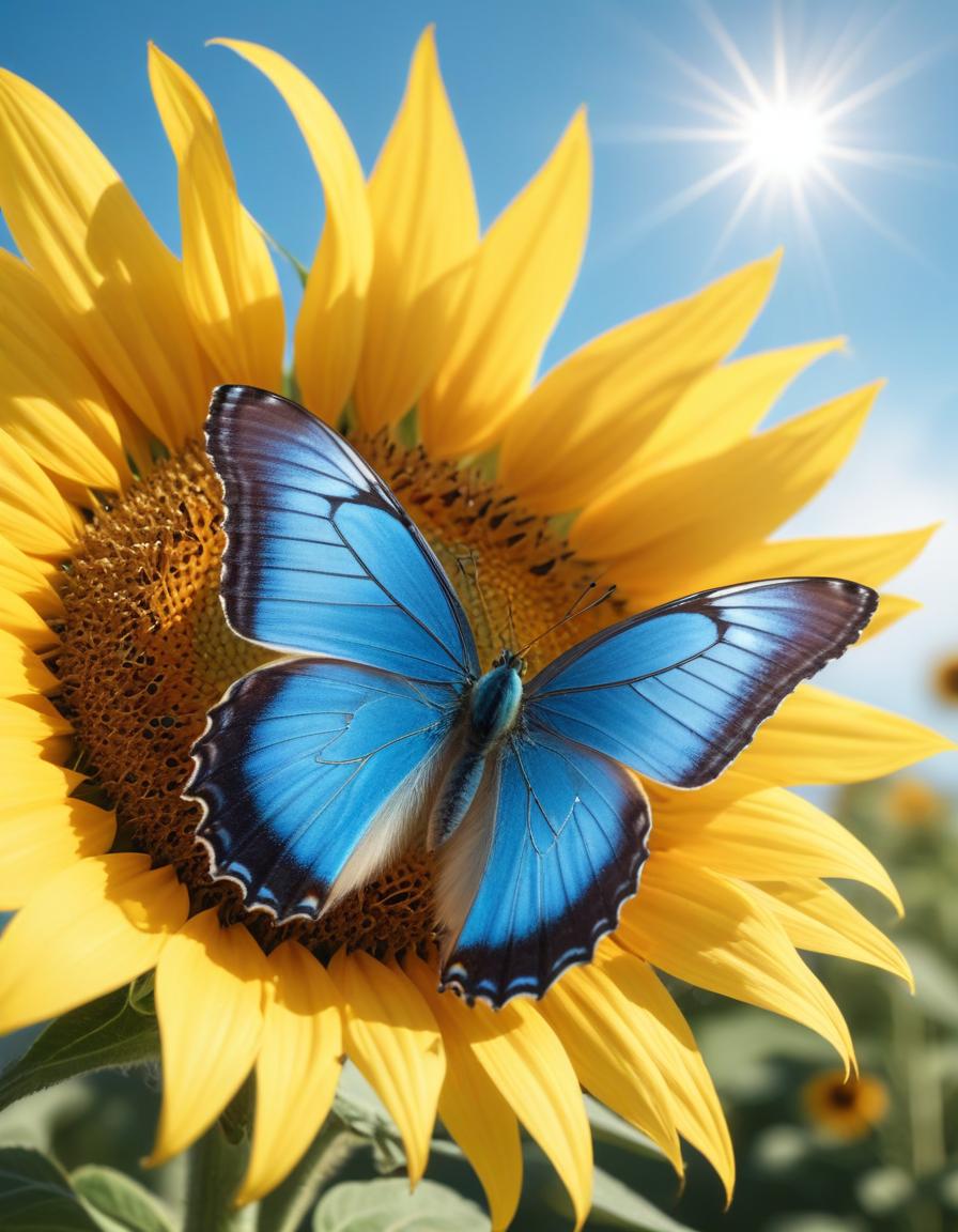 A vibrant blue butterfly perches on a sunflower, basking in sunlight against a clear blue sky.