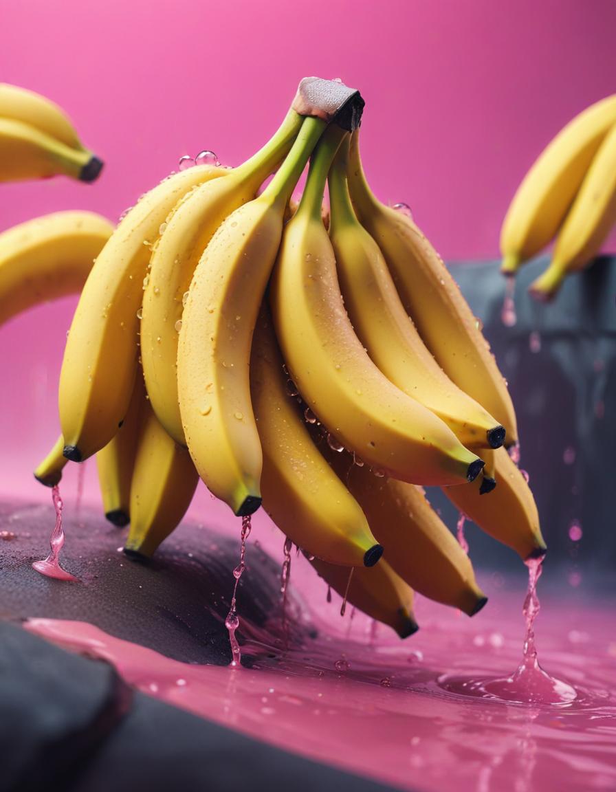 Juicy bananas are placed against a vibrant pink backdrop, glistening with water droplets.