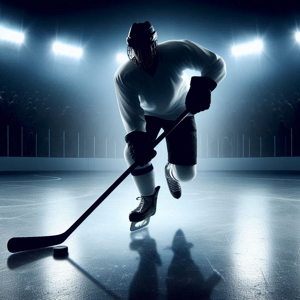A hockey player glides across the ice, preparing to shoot the puck in a dimly lit arena.
