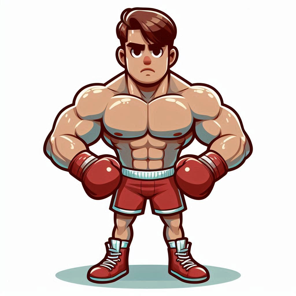 A muscular cartoon boxer stands confidently, showcasing his physique and ready for action in red shorts and gloves.