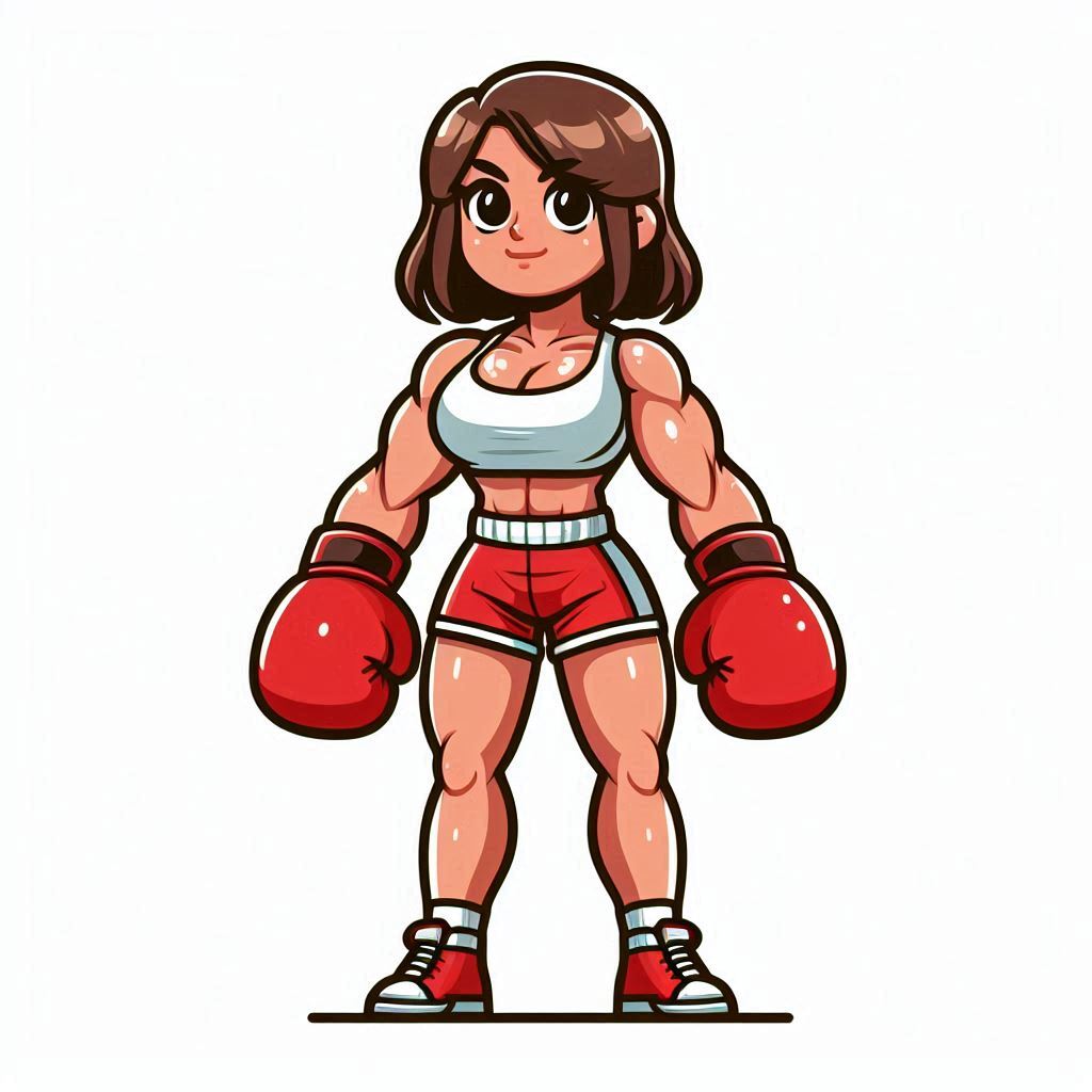 athletic, boxer, cartoon, character, competition, confidence, crop, determination, empowerment, female, fitness, gloves, illustration, muscles, red, shorts, sport, strength, top, training