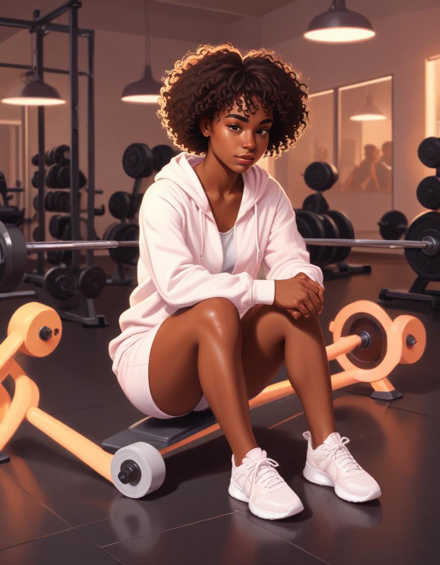 A young woman sits on workout equipment in a gym, resting after an intense training session.