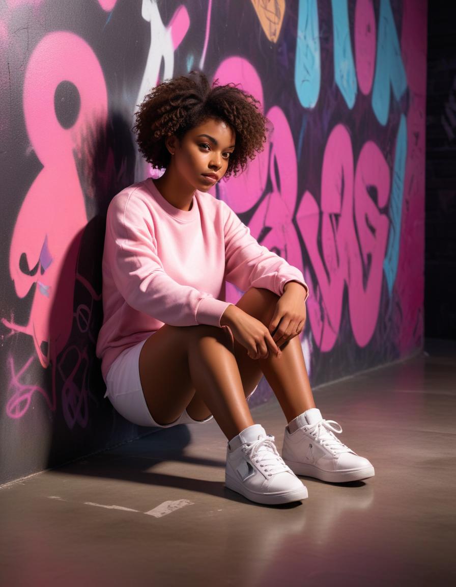 A young woman sits casually on the floor, dressed in a pink sweater and white shorts, leaning against a colorful graffiti wall.
