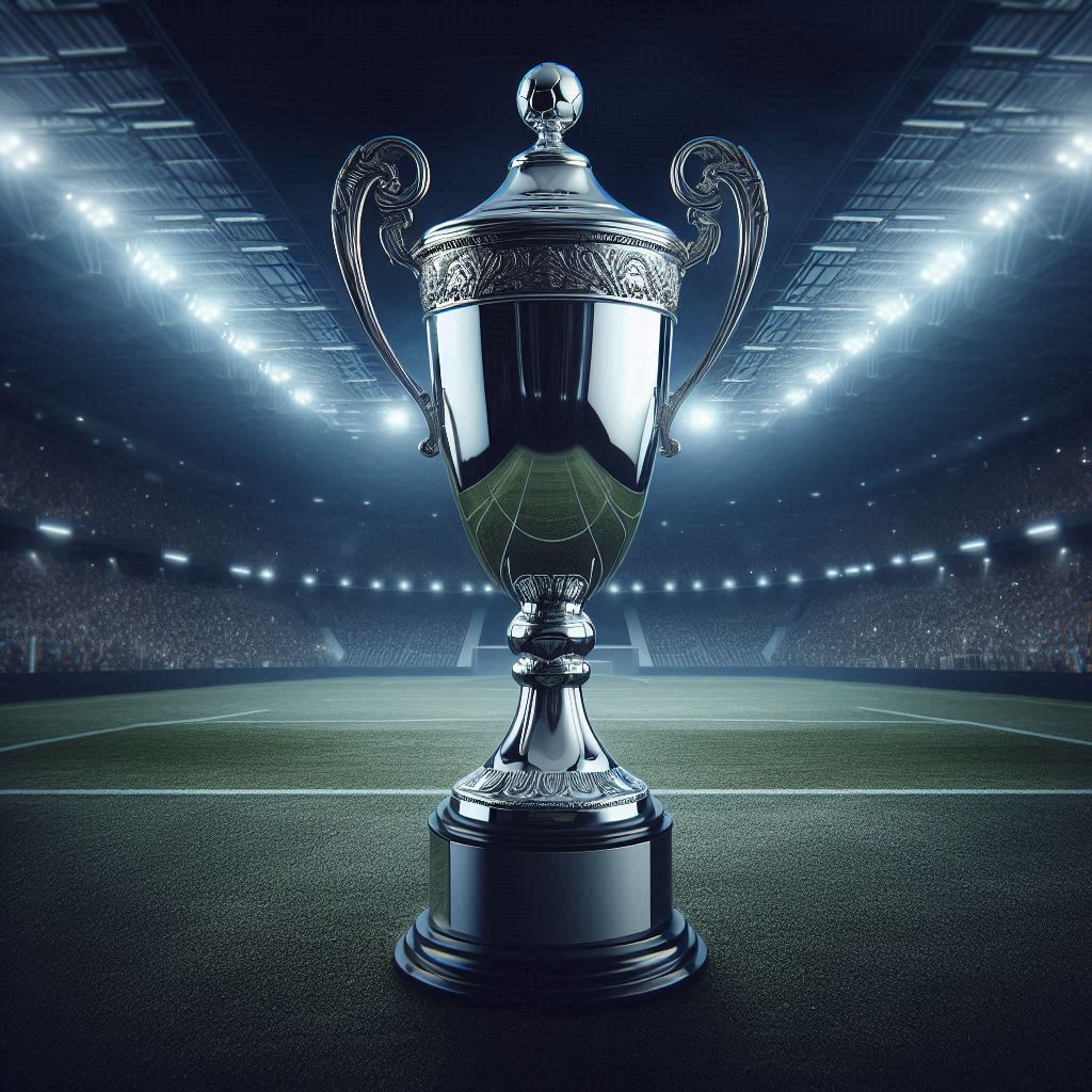 A shining trophy stands prominently on a football field under stadium lights.