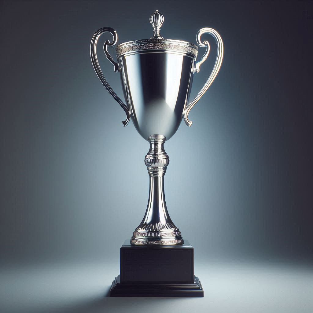 A gleaming silver trophy is illuminated by spotlight, resting on a black base.