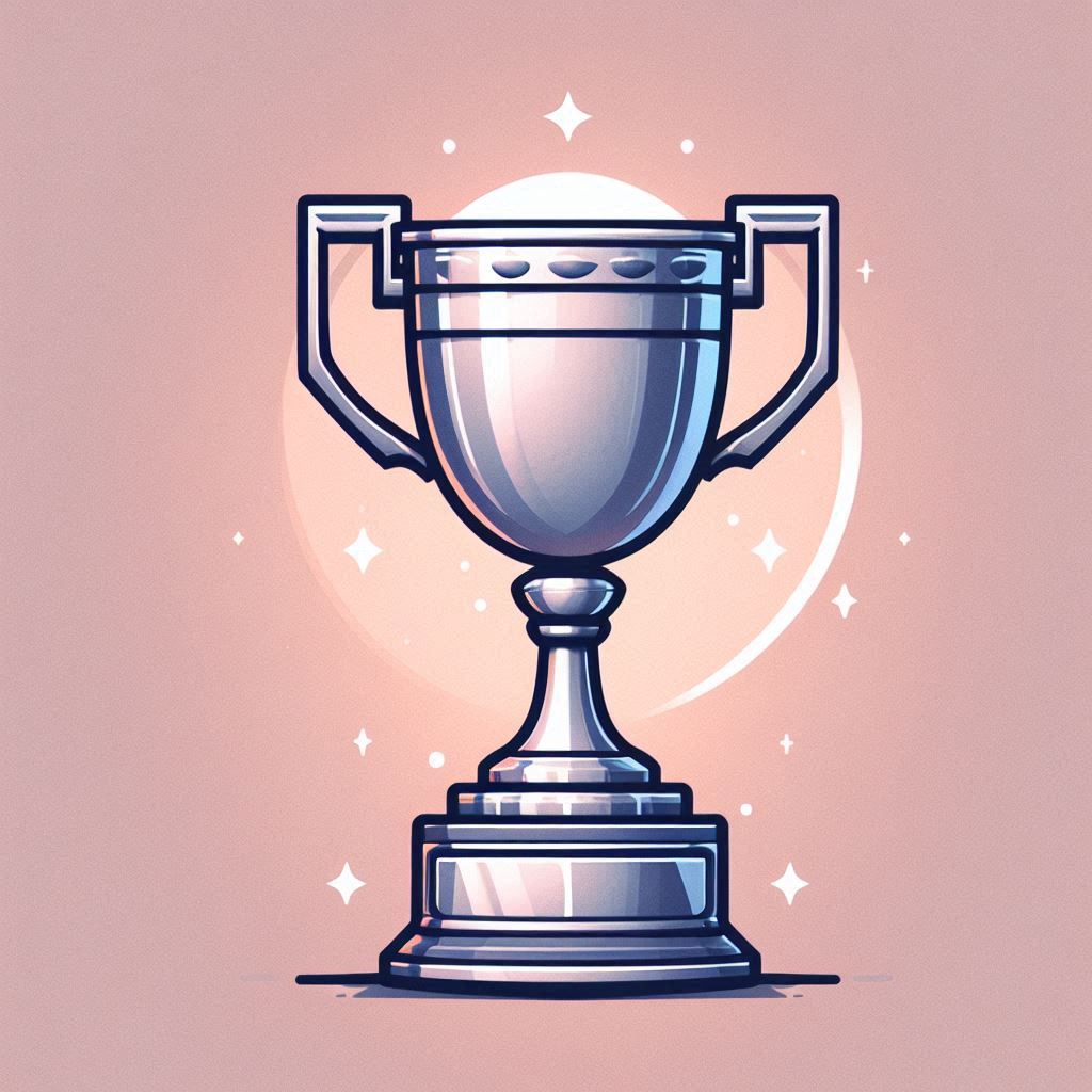 A shiny silver trophy sits elegantly, surrounded by sparkling effects against a soft pastel background.
