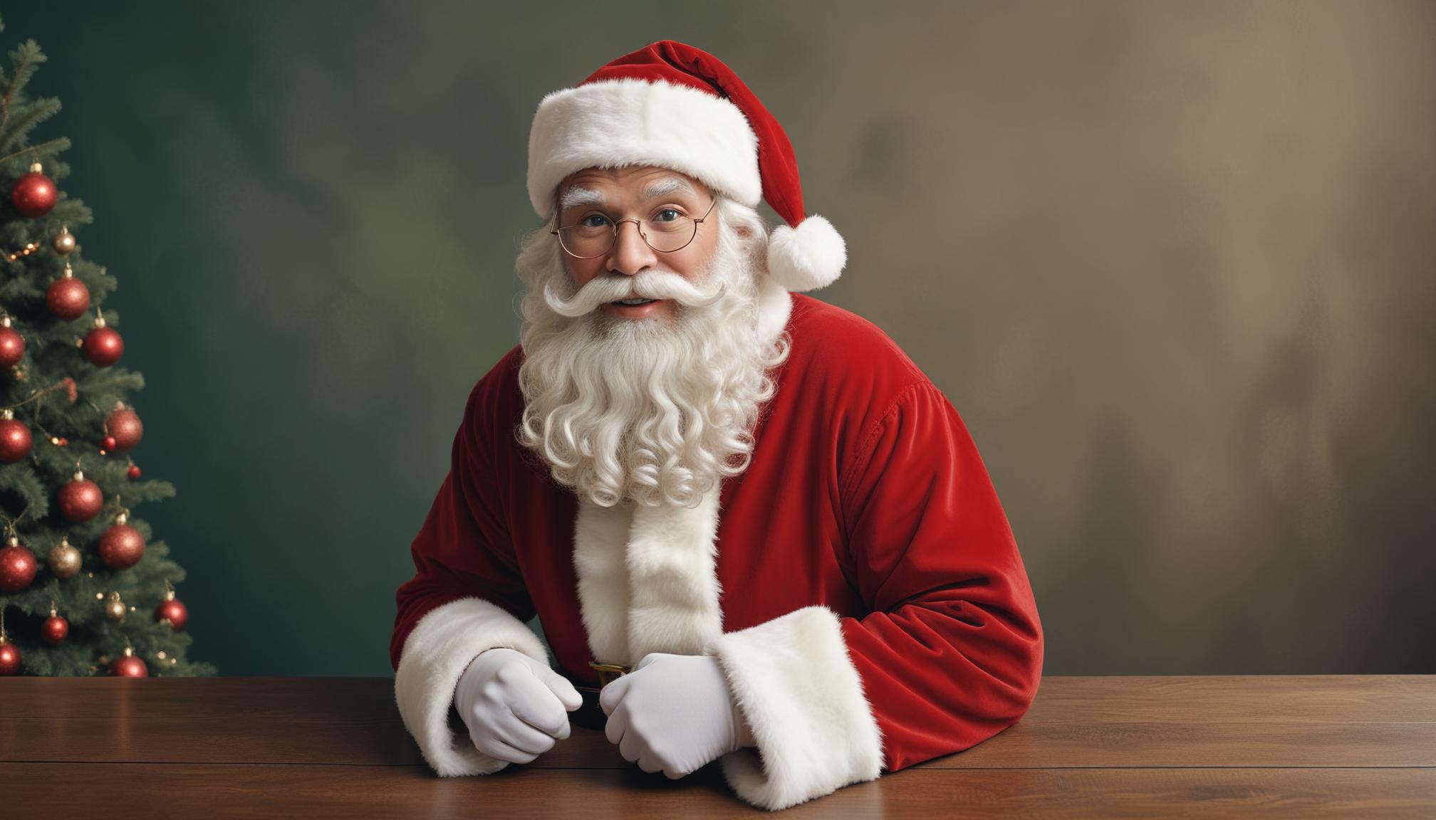 Santa claus sitting at a table with christmas tree