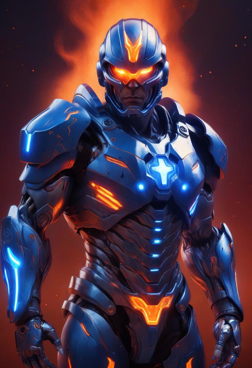armor, art, battle, blue, character, cybernetic, design, digital, fire, futuristic, glowing, heroic, illustration, intense, neon, robot, sci-fi, strength, technology, warrior