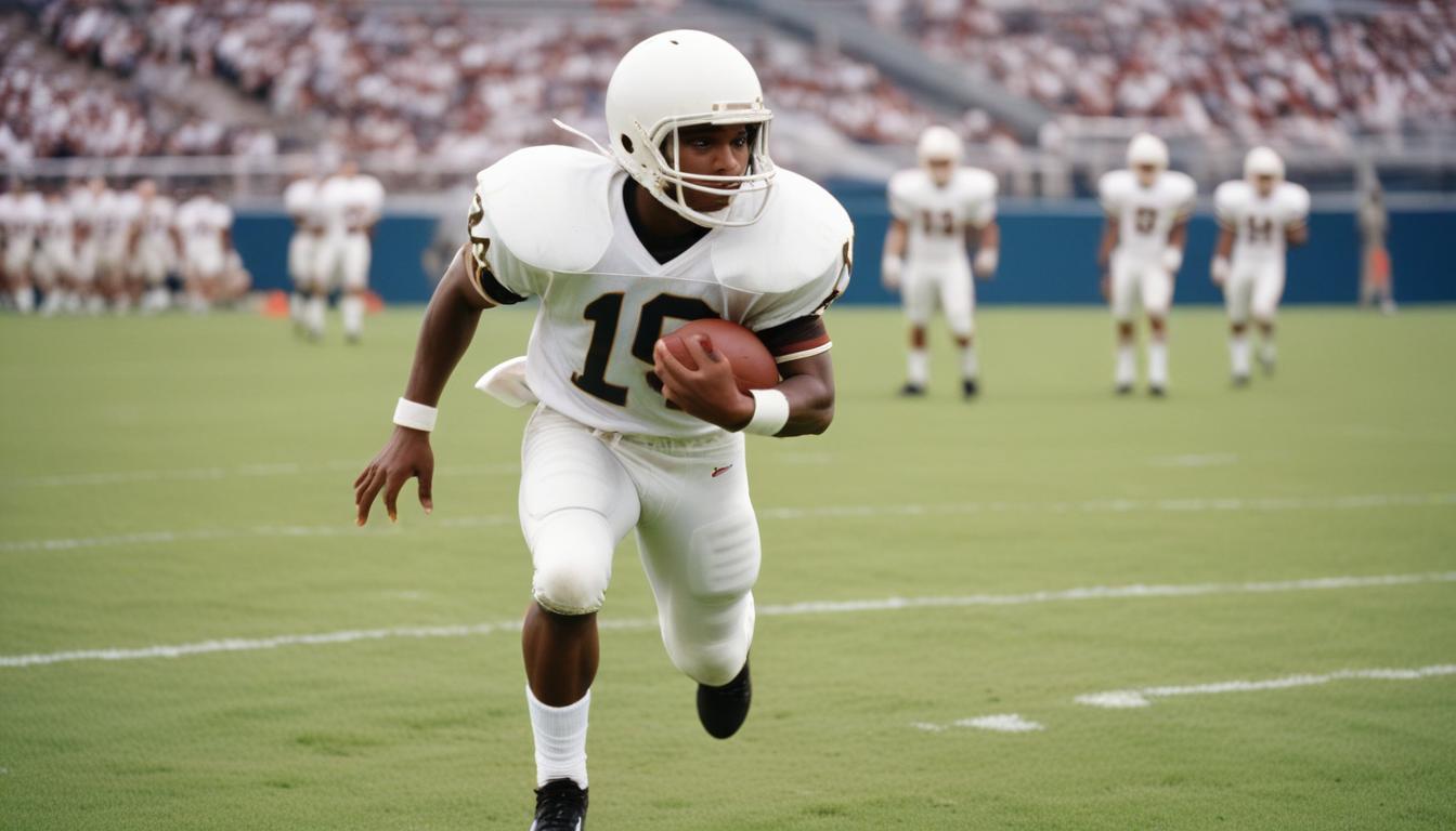 Football player running with ball on field during game