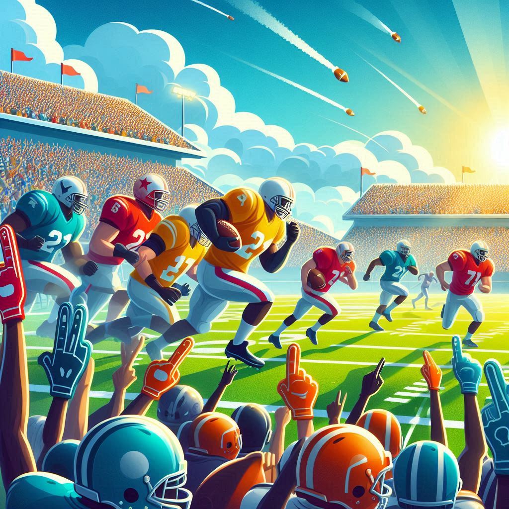 athletes, cheering, competition, crowd, excitement, fans, football, game, helmets, players, running, scoreboard, sports, stadium, strategy, sunset, tackling, teamwork, uniforms, victory