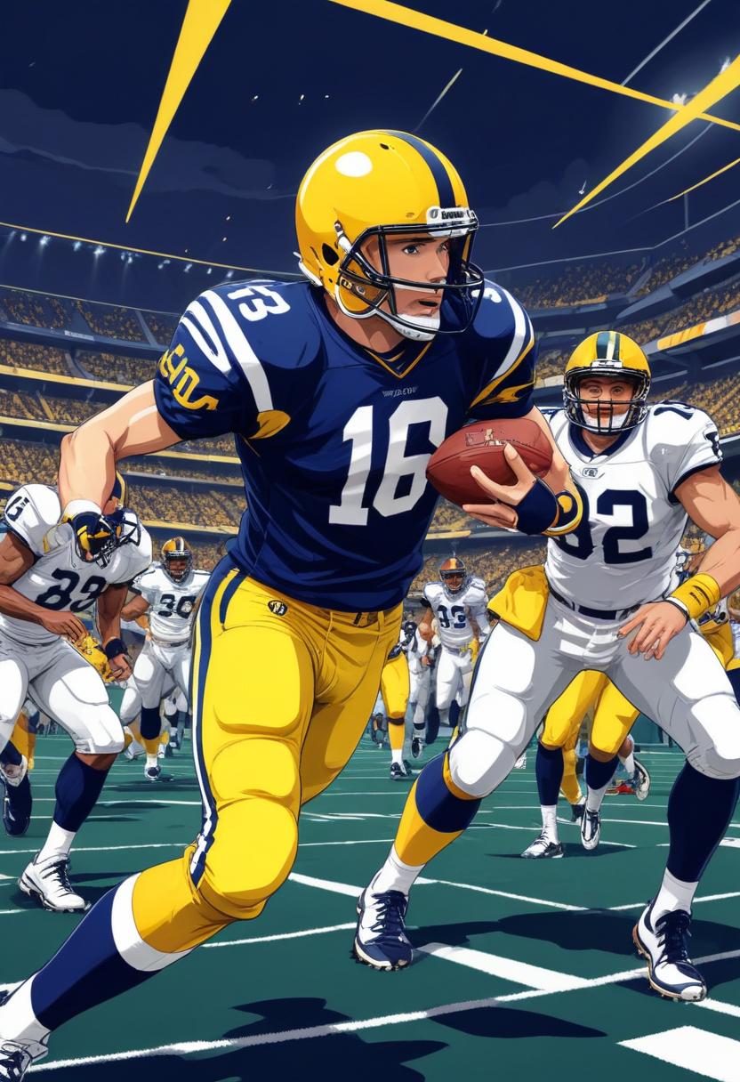 action, athletic, ball, championship, college, competition, crowd, defense, excitement, field, football, pass, player, running, score, sports, stadium, tackle, team, uniforms