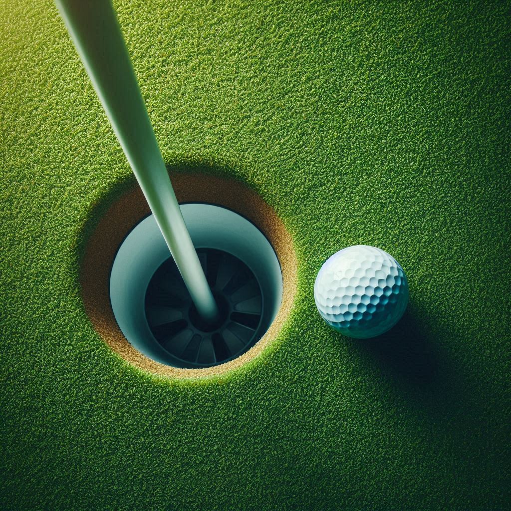 Golf ball near hole on green turf at sunset