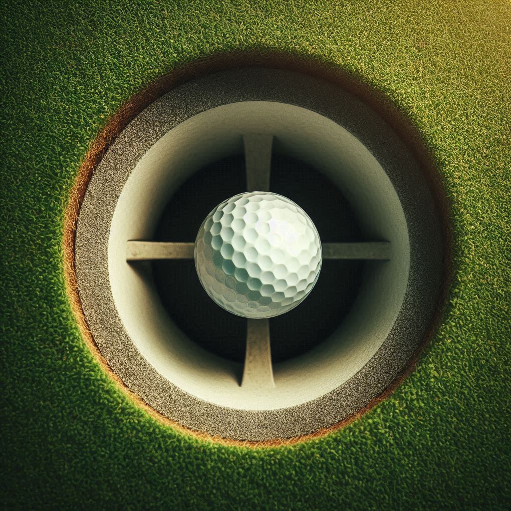A golf ball rests perfectly in the hole on a well-manicured green.