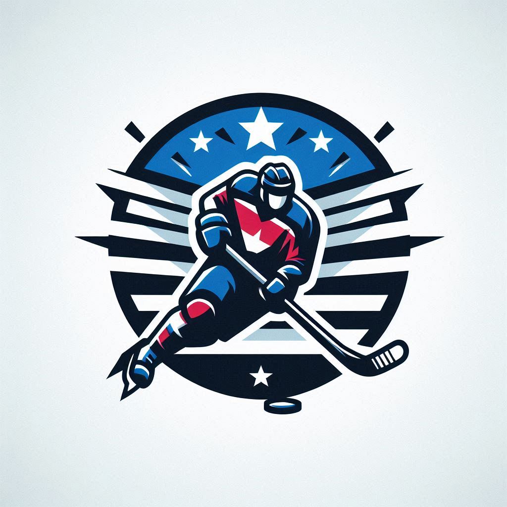 A dynamic hockey player skates while puck moves, surrounded by a star-adorned background.