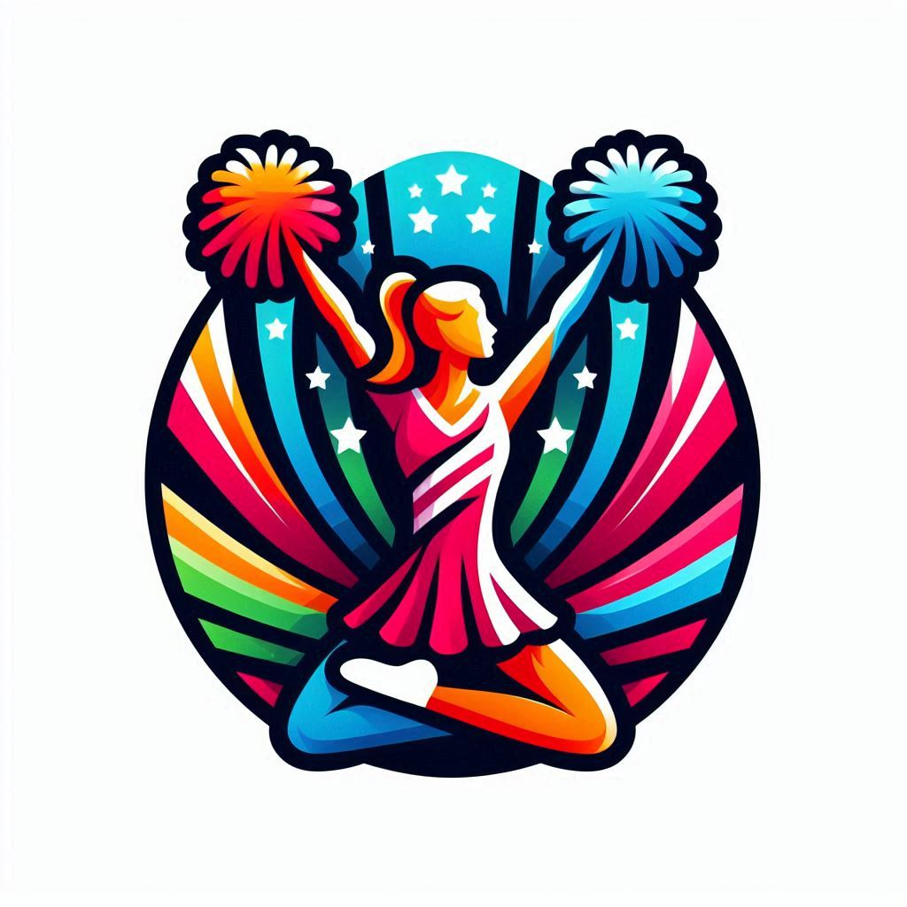 A cheerleader leaps joyfully while holding colorful pom poms, surrounded by vibrant rays and stars.
