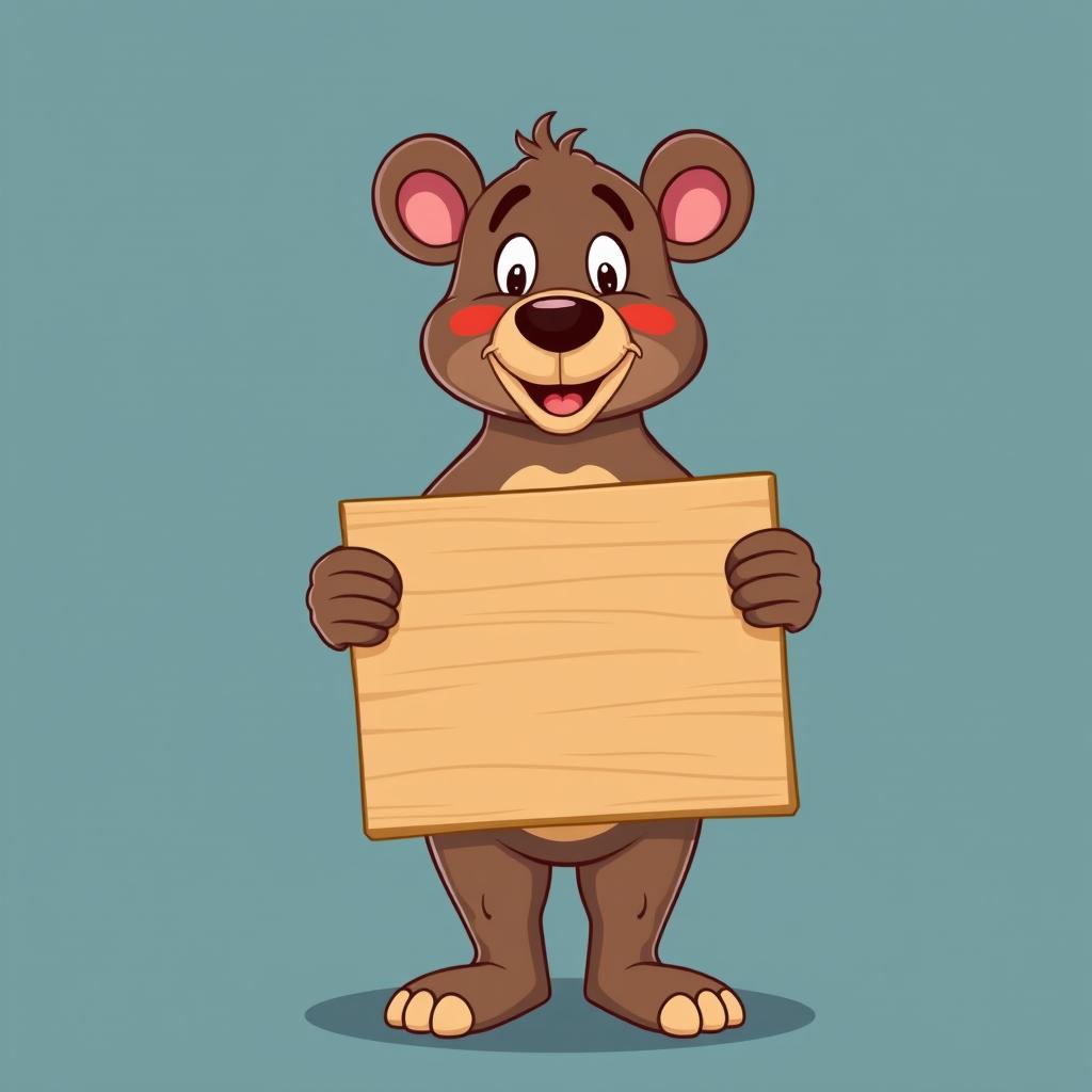 A cheerful cartoon bear with rosy cheeks holds a blank sign against a solid light blue background.