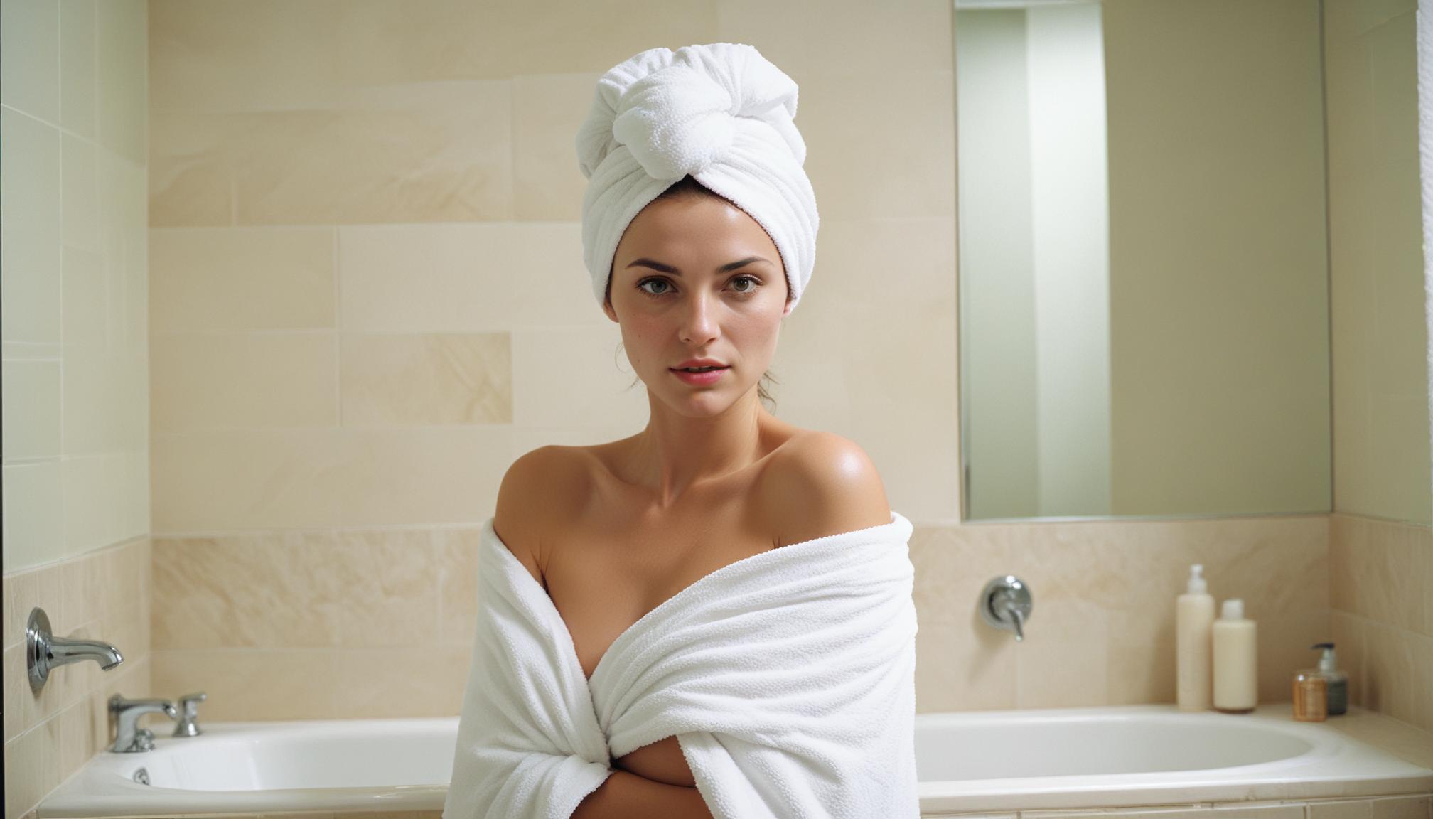 A woman stands wrapped in a towel with a serious expression in a contemporary bathroom after a shower.