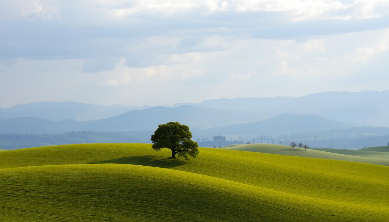 A lone tree stands atop rolling green hills beneath a cloudy sky.
