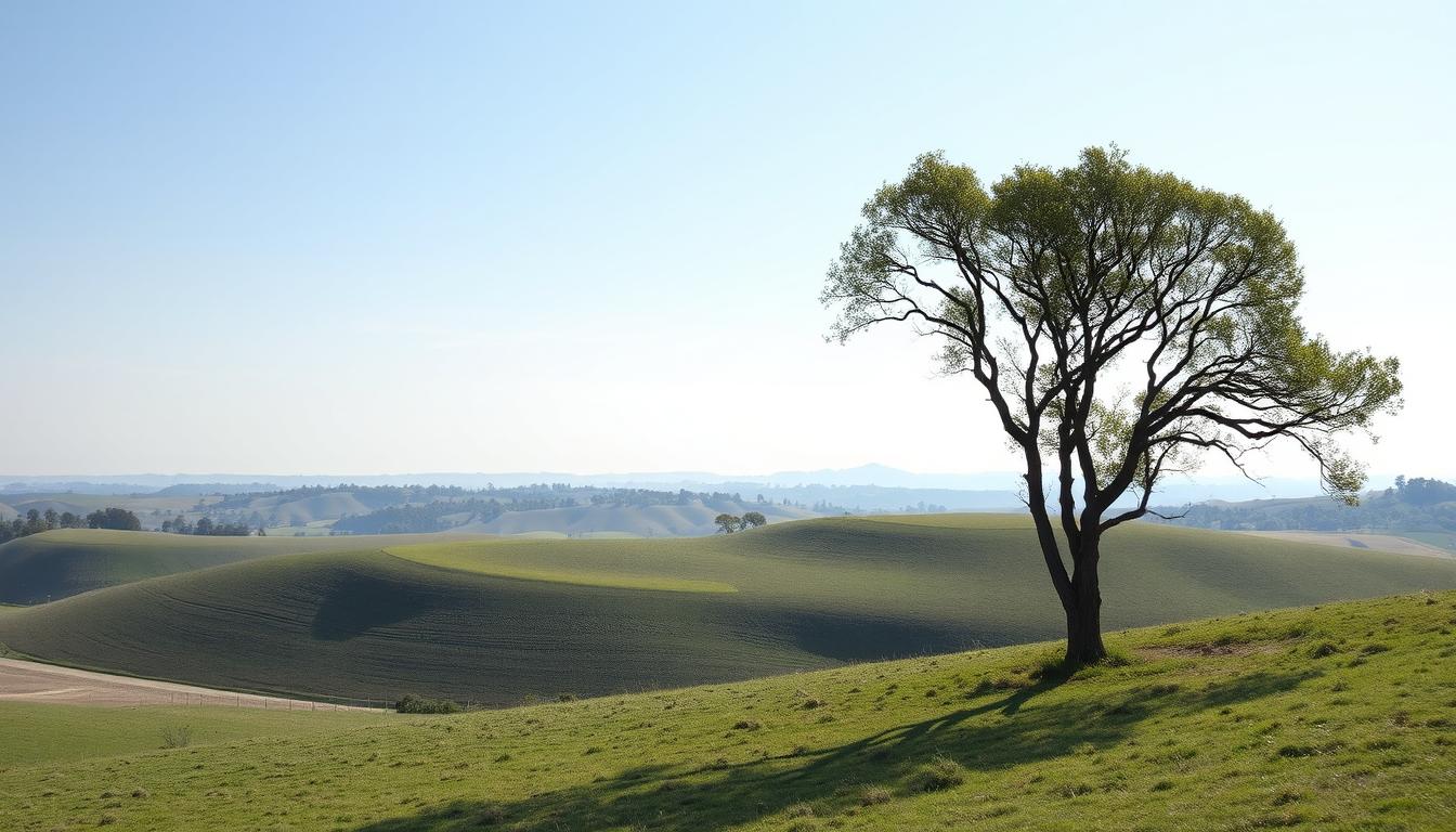 Lone tree on rolling hills under clear blue sky