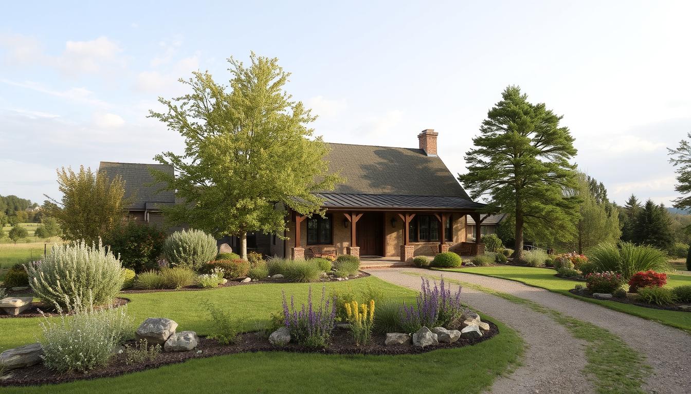 architecture, country, flowers, front, garden, greenery, home, house, landscaping, nature, outdoor, path, peaceful, rural, rustic, serene, shrubs, sunlight, trees, yard