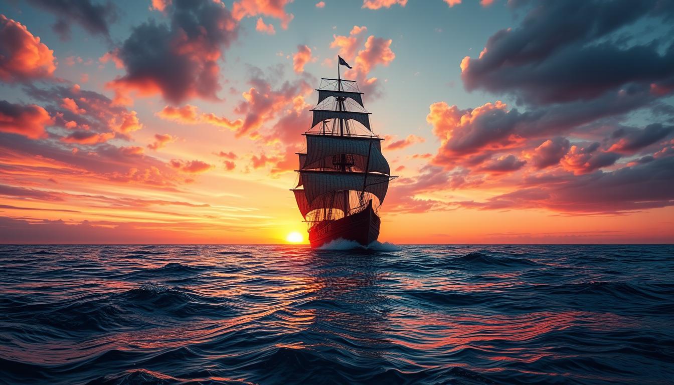 A majestic sailing ship glides through calm waters as a vibrant sunset paints the sky.