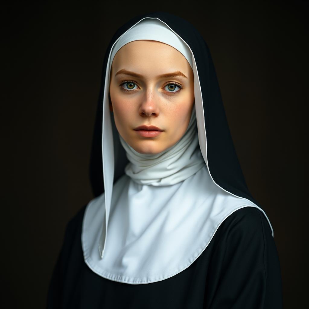 A nun dressed in traditional attire gazes directly at the viewer.
